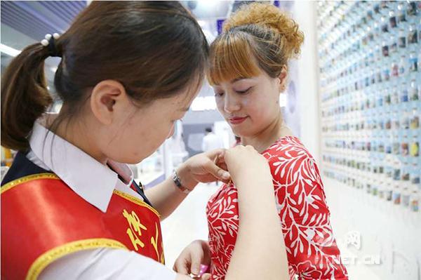 工作人员为参观者佩戴毛主席像章