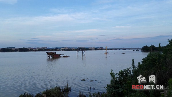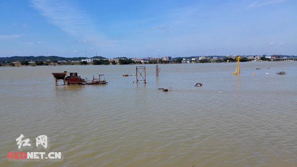 时至上午九点,洪水已退去十厘米,水面露出了一些被淹的采砂设备。