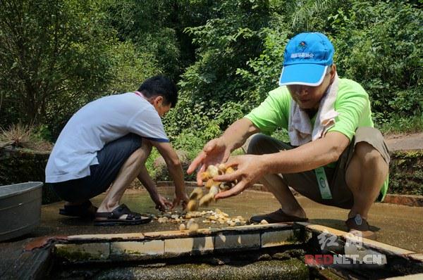 环保志愿者往古井里投放河卵石,起到过滤作用。