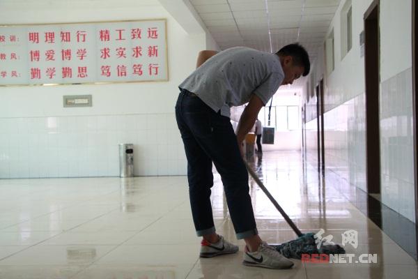 学生在教学区进行卫生清扫。