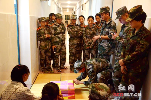 退伍大学生教新生叠被子。(郭远业/摄)