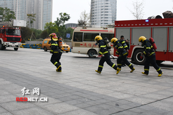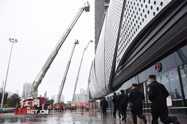 “万达广场15楼因电路短路,引燃可燃装饰材料发生火灾,楼内有人员被困,请求支援。”万达商场安保人员发现火情后第一时间拨打“119”报警。当天上午10时30分,随着商场保安的报警,实战演练正式开始。接到报警后,119指挥中心迅速调出3个中队、4台重型水罐车、1台多功能抢险救援车、3台高喷车,40名消防官兵进行扑救。经过30分钟的艰苦奋战,被困人员成功获救,一场惊心动魄的高层建筑灭火救援消防演练圆满结束。