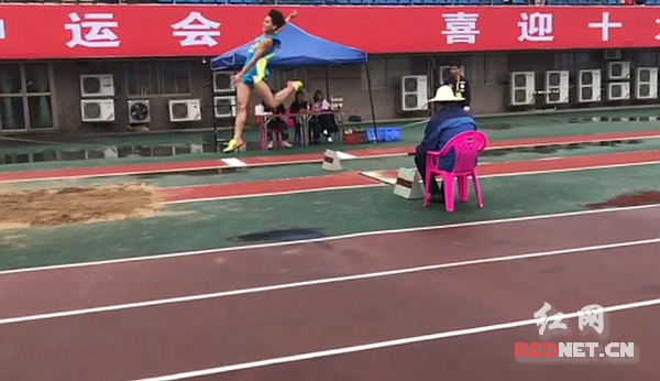来自湘潭市一中的罗凡参加跳远比赛。