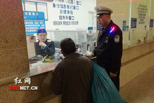 10月16日凌晨1点左右,出警返程的湘潭市公安局交警支队岳塘大队一中队的值班民警朱升桥发现风雨交加的寒夜中,马路边坐在一位神情呆滞的老人,并且没带任何雨具。朱升桥询问得知,原来老人是和同乡从衡阳来湘潭打工的,由于年老体衰,同乡们嫌弃他做事很慢,不愿再与他共事,于是他只好独自离开,但由于身无分文,也不知道回家的路,只能流落街头。