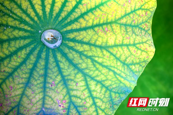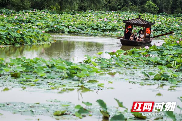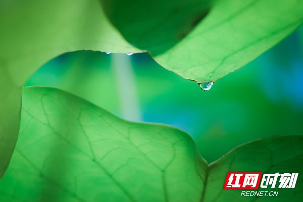 7月1日,经历了一个星期高温酷热的湘潭,终于迎来了久违的雨水。盘龙大观园荷花园内,夏荷初开。清凉的雨水落在碧绿的荷叶上,蹦跳、翻滚着,恰似“大珠小珠落玉盘”。不时有风吹过,荷塘中摇曳一片。叶中的水珠便又乘着风,从这片荷叶滚到下一片荷叶,最后带着清香,落入水中,泛起圈圈涟漪。