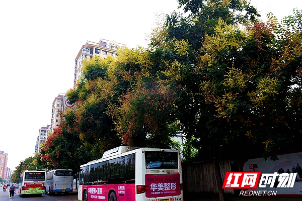 在东泗路边一处公交车停靠点旁,栾树的树冠像一把把打开的大伞,“伞”上涂抹着金红的颜色,遮盖着路旁的公交车。