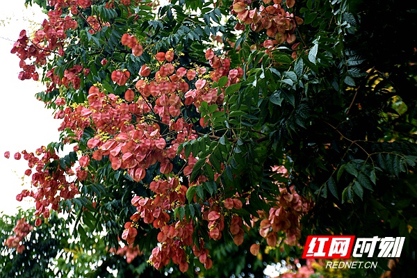 9月,正是栾树争艳的时节。在湘潭市的湖湘东路和东泗路边,一棵棵栾树绽放的黄色小花宛若星点灯光,红色的果子如一串串红色的铃铛,又似小小的灯笼。远远望去,一行行绿色的树冠上“张灯结彩”,将初秋装扮得更加色彩缤纷。