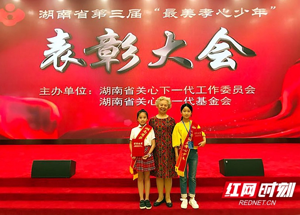 陈佳鑫(左一)和杨雨晴(左二)荣获全省“最美孝心少年”称号。