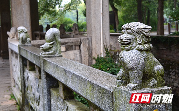 夕照亭的石栏顶部雕琢了各类走兽的小石雕,动作、神态各异,十分可爱有趣。