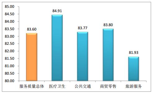 本次服务质量满意度测评包含医疗卫生、公共交通、商贸零售、旅游服务四个方面。经评测,四个方面的服务质量均属于“优良”水平。其中,医疗卫生服务质量评价最高,为 84.91 分;其次是商贸零售的服务质量,满意度得分为 83.77 分;旅游服务方面的服务质量评价相对最低,为 81.93 分。与服务质量总体得分相比,医疗卫生、公共交通、商贸零售三个方面的服务质量得分高于总体服务质量得分,旅游服务质量满意度得分低于总体服务质量得分。