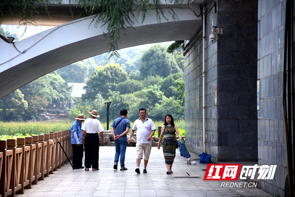 三三两两的市民在湖湘公园散步。