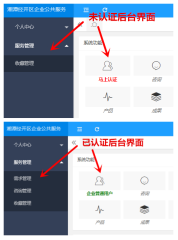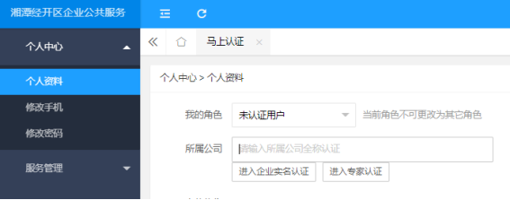 (2)后台主界面系统企业用户工作门户界面如下图3.1.2所示,个人中心提供了个人资料、认证中心、基础信息管理、服务管理和运营管理功能,此时你就可以将想要展示公布的信息在此编辑发布了~