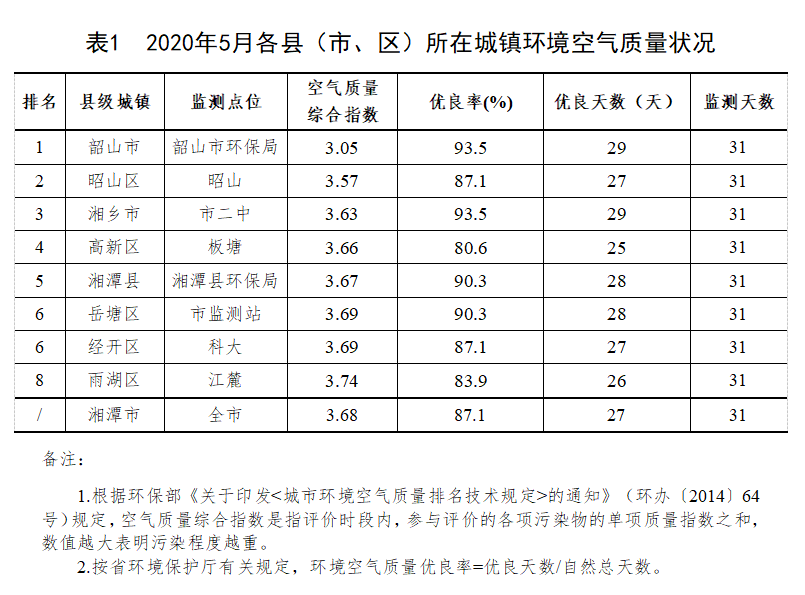 根据省政府要求及《湖南省环境质量监测考评办法(试行)》(湘环发〔2016〕10号)的规定,现将2020年5月全市环境质量状况通报如下: