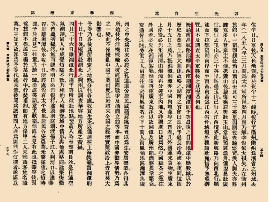 既过南昌,航路则转向西南,趋湘潭。湘潭即予等最后之目的地。途中历数城,以于历史及商业上无大关系,故略之。湖南之省会曰长沙。予过长沙时,适在夜间。迨4月15日之晨,乃抵湘潭。湘潭亦中国内地商埠之巨者。凡外国运来货物,至广东上岸后,必先集湘潭,由湘潭再分运至内地。又非独进口货为然,中国丝、茶之运往外国者,必先在湘潭装箱,然后再运广东放洋。以故湘潭及广州间,商务异常繁盛。交通皆以陆,劳动工人肩货往来于南风岭者,不下十万人。南风岭地处湘潭与广州之中央,为往来必经之孔道,道旁居民,咸藉肩挑背负以为生,安居乐业,各得其所。迨后外洋机械输入,复经国际战争及通商立约等事,而中国劳动界情势,乃为之一变。此不仅扰乱中国工业制度,且于将来全国之经济、实业、政治上,皆有莫大影响也。