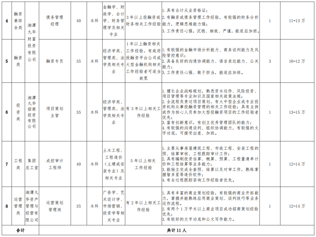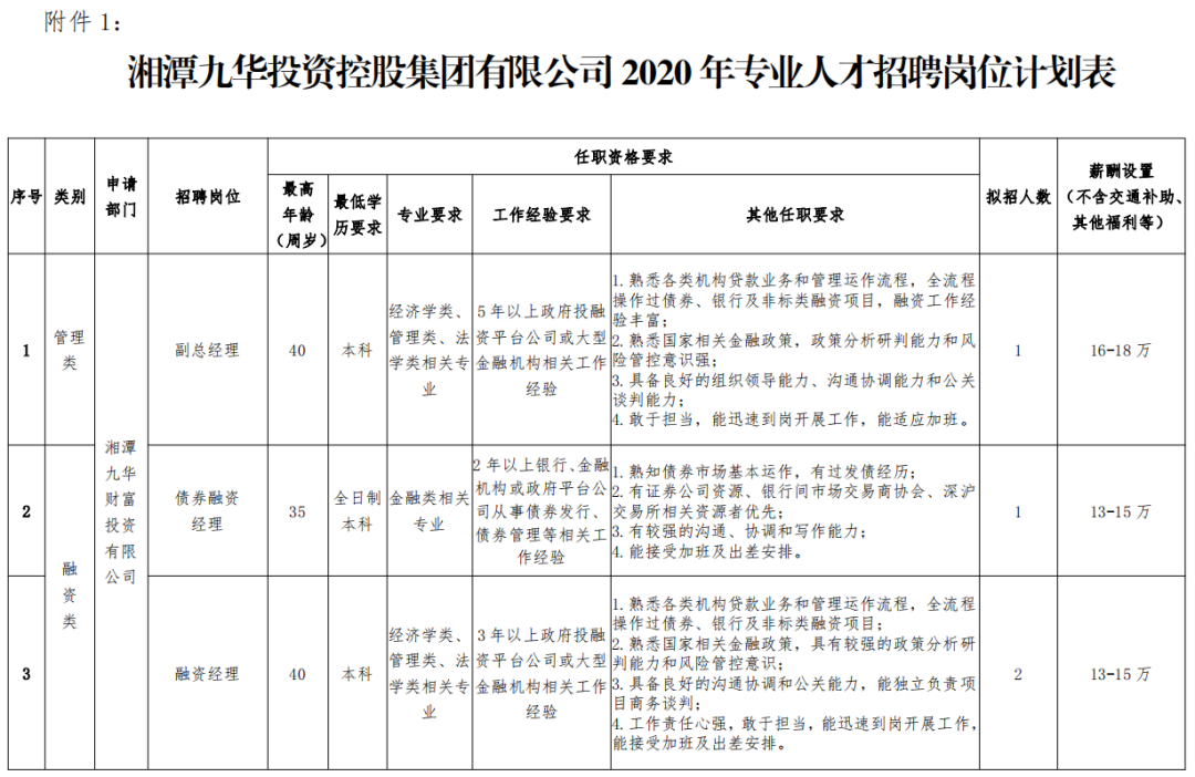 本次计划招聘管理类、融资类、投资类、工程类、运营管理类等5类岗位,具体招聘岗位及职责要求详见《湘潭九华投资控股集团有限公司2020年专业人才招聘岗位计划表》(见附件1)。