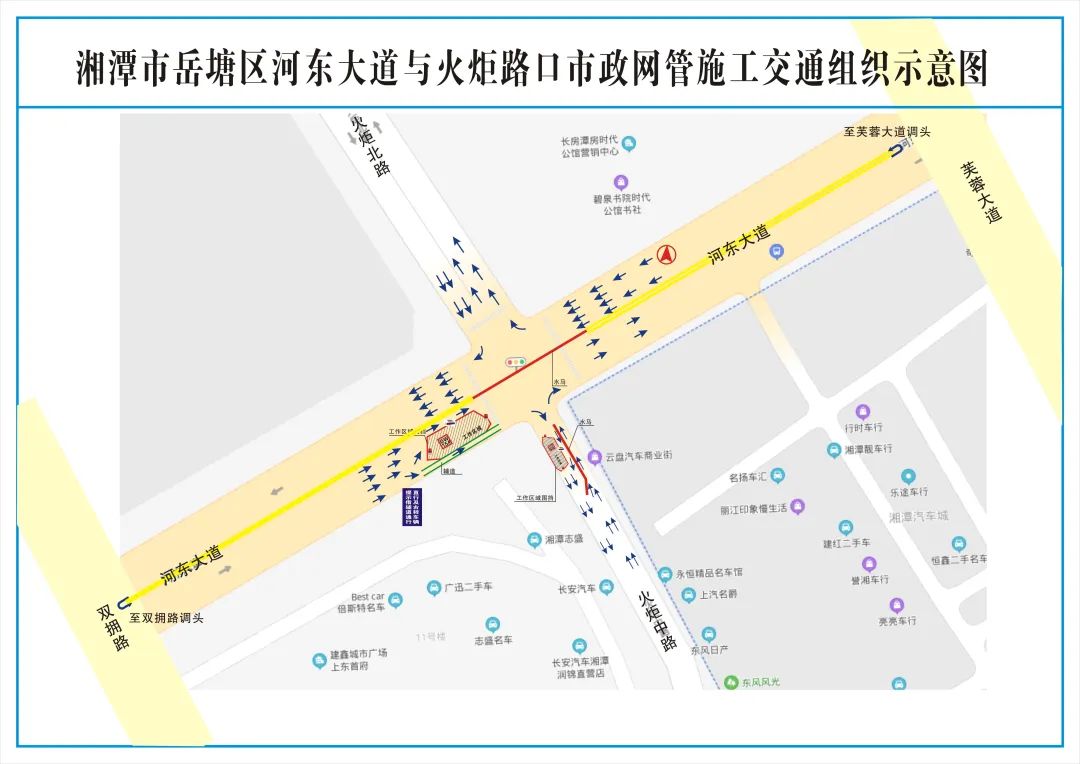 因岳塘区汽车城片区雨污分流改造项目工程施工的需要,施工单位湖南旺和建设工程有限公司申请在岳塘区河东大道火炬路口西向和南向各占用半幅路面进行占道施工,根据《中华人民共和国道路交通安全法》和《中华人民共和国道路交通安全法实施条例》的有关规定,湘潭市公安局交通警察支队决定于2020年11月1日至12月20日对岳塘区河东大道火炬路口实施交通管制,交通管制期间封闭路口河东大道中央绿化带,中断南北方向交通,火炬路车辆只能右进右出通过路口,河东大道车辆只能直行或右转弯通过路口,路口交通信号灯临时关闭。