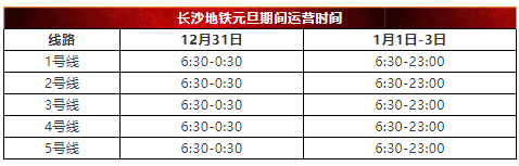 延长运营服务时间12月31日,长沙地铁5条线路将运营服务时间延长至次日00:30;1月1日-1月3日,运营调度指挥中心将密切关注客流变化情况,适时调整列车运行计划。如遇大客流,长沙地铁将考虑采取延长运营服务时间、加开备用车等措施。