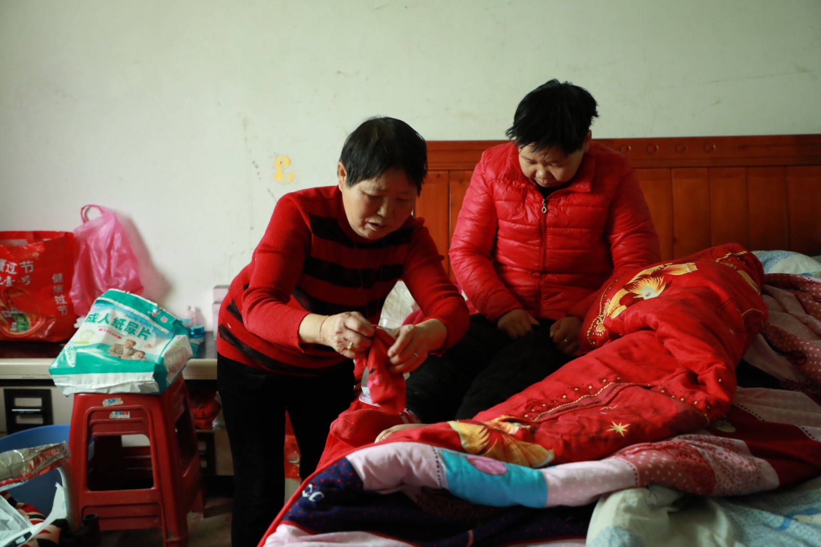 上午10点多,汤爱兰老人熟练地为瘫痪在床的儿媳蒋小聪洗脸漱口,换上成人纸尿裤,又把床上的衣服叠整齐,打开窗户给房间通风。安顿好儿媳,老人开始准备午饭。汤爱兰说,自从2013年儿媳患上精神分裂症又不幸瘫痪后,这些事情成了她每天的“必修课”。