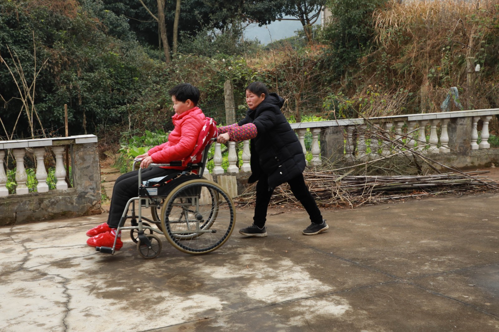 汤爱兰今年已72岁,每天抱着比自己重得多的儿媳上下床,推着轮椅带她出去散心。蒋小聪下半身毫无知觉,需要人工排便,汤爱兰每次会点上两根香、喷上空气清新剂,使用药物为她排便。