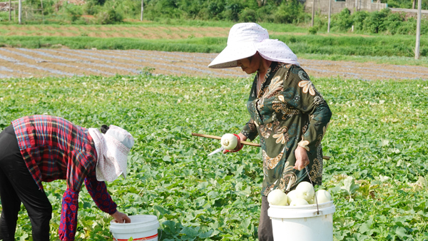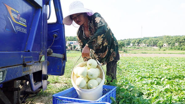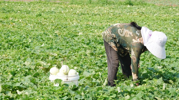 村民们正顶着烈日采摘、装运甜瓜。