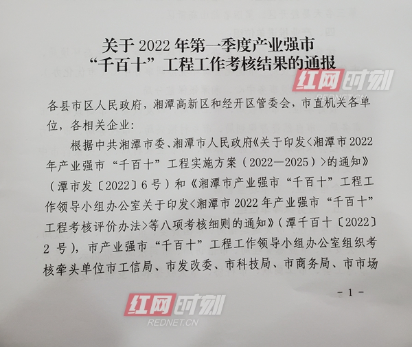湘潭市发布2022年第一季度产业强市“千百十”工程工作考核结果通报
