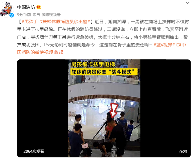 近日,湖南湘潭,一男孩在商场上扶梯时不慎将手卡进了扶手缝隙。正在休假的消防员路过,二话没说,立即上前查看后,飞奔至附近门店,寻找螺丝刀等工具进行紧急破拆。大概十分钟左右,将小男孩手臂顺利抽出,帮其成功脱困。Ps:无论何时警情就是命令,这是刻在骨子里的责任。