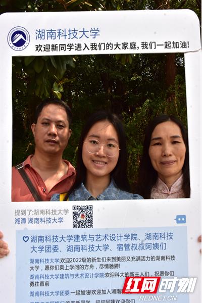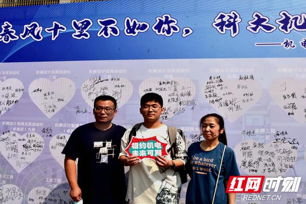 新生与家人在签到墙前留下合影。