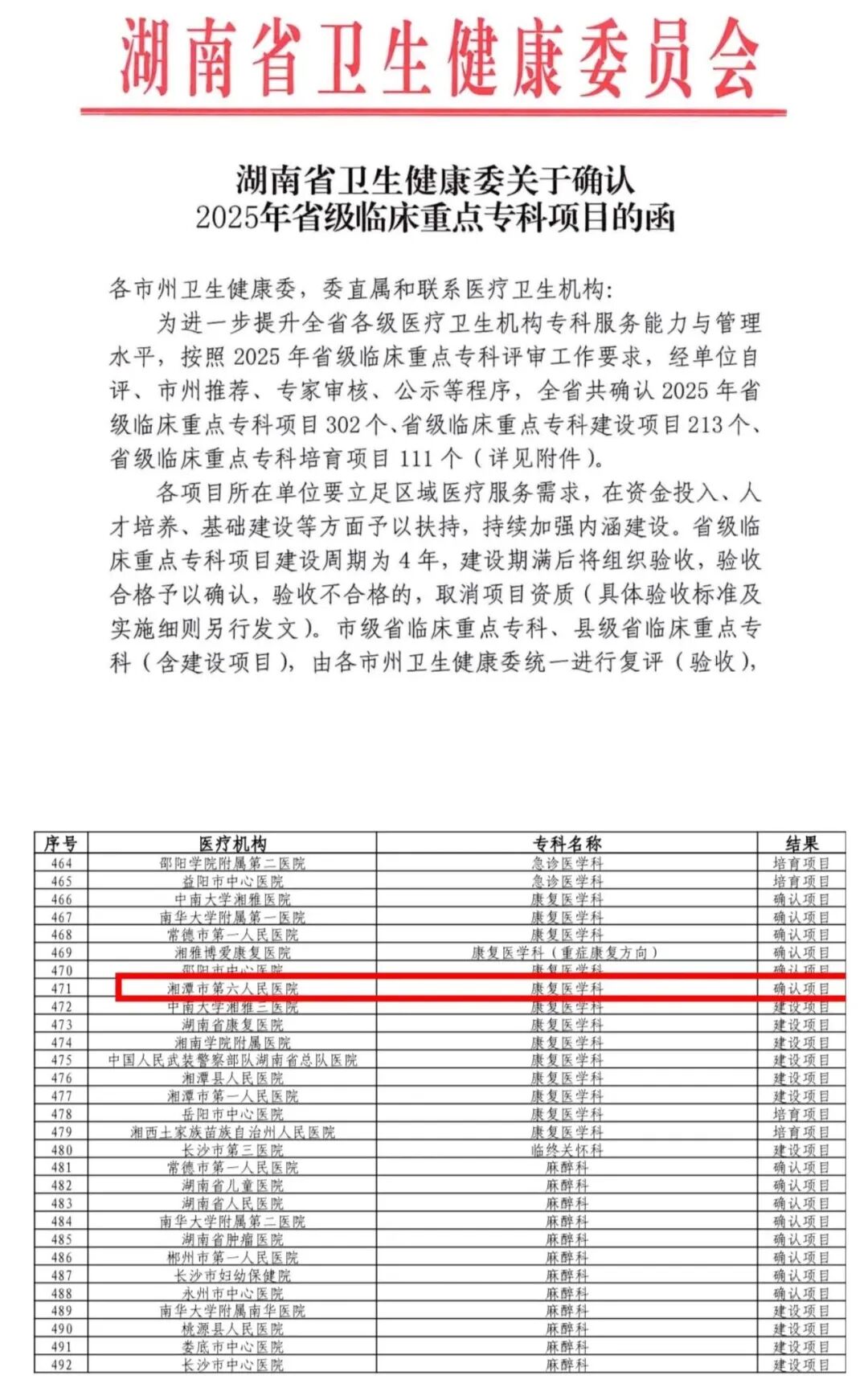 10月,湘潭市第六人民医院康复医学科被确认为2025年省级临床重点专科。