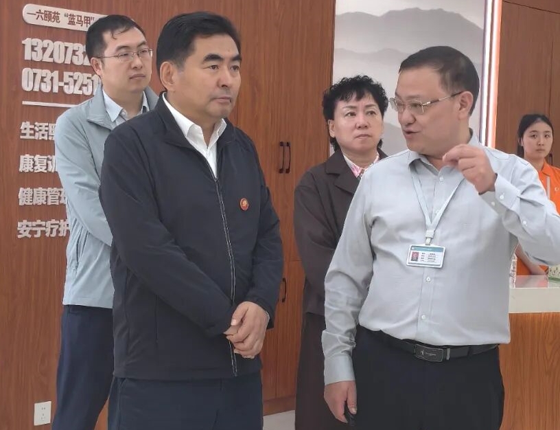 5月8日,湖南省人大常委会委员、社会委主任委员祁圣芳(左)率队到湘潭市六医院·六颐苑调研并给予充分肯定。
