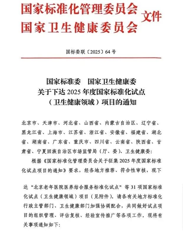 11月,国家标准化管理委员会、国家卫生健康委公布了2025年度国家标准化试点(卫生健康领域)项目名单,湘潭市六医院·六颐苑申报的医养协同服务标准化试点项目成功入选(全省唯一)。