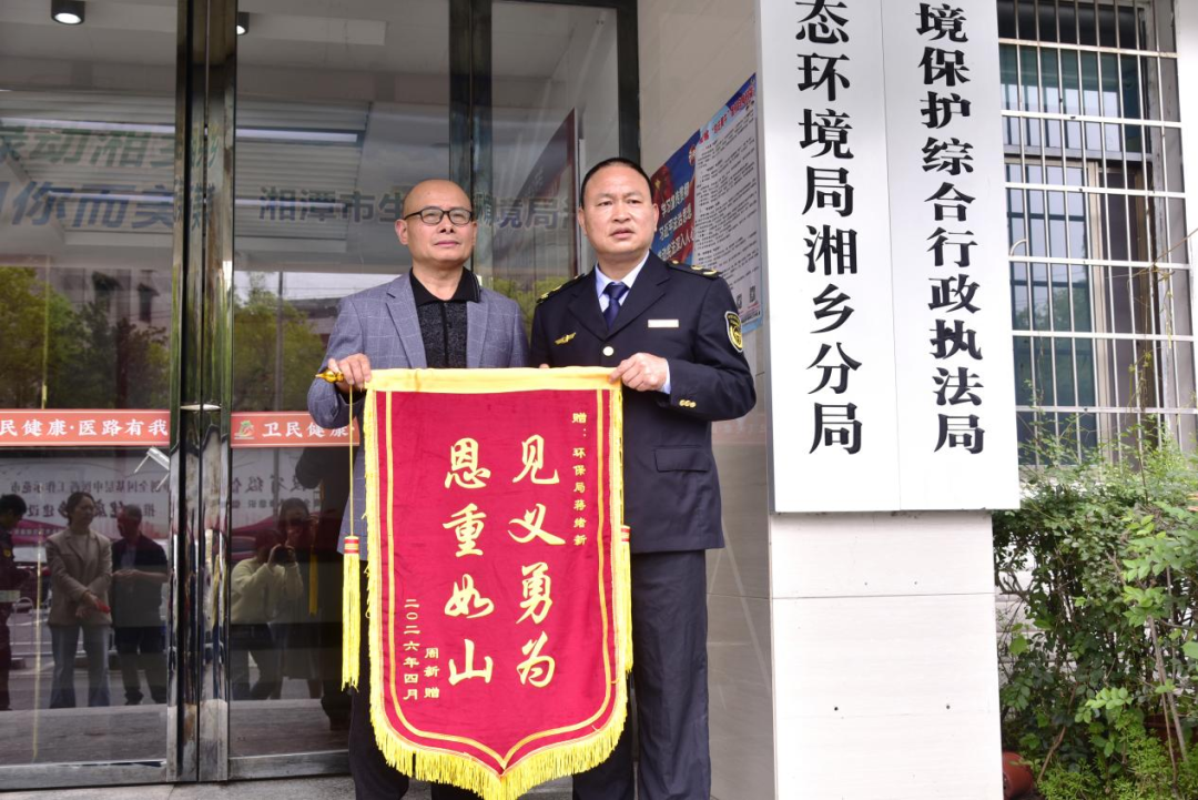 4月8日上午,湘潭市生态环境局湘乡分局上演暖心一幕,市民周先生专程送来锦旗,紧紧握住蒋绪新的手,眼眶泛红,声音哽咽:“感谢你救了我女儿,你是我全家的恩人!”