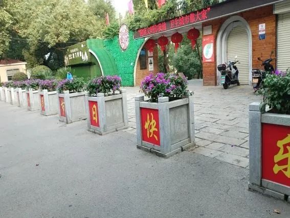 为了烘托浓厚的节日气氛,市内各大公园还在公园入口处悬挂红旗、彩旗、灯笼、横幅等装饰物。鲜花、彩旗与公园的景色交相辉映。