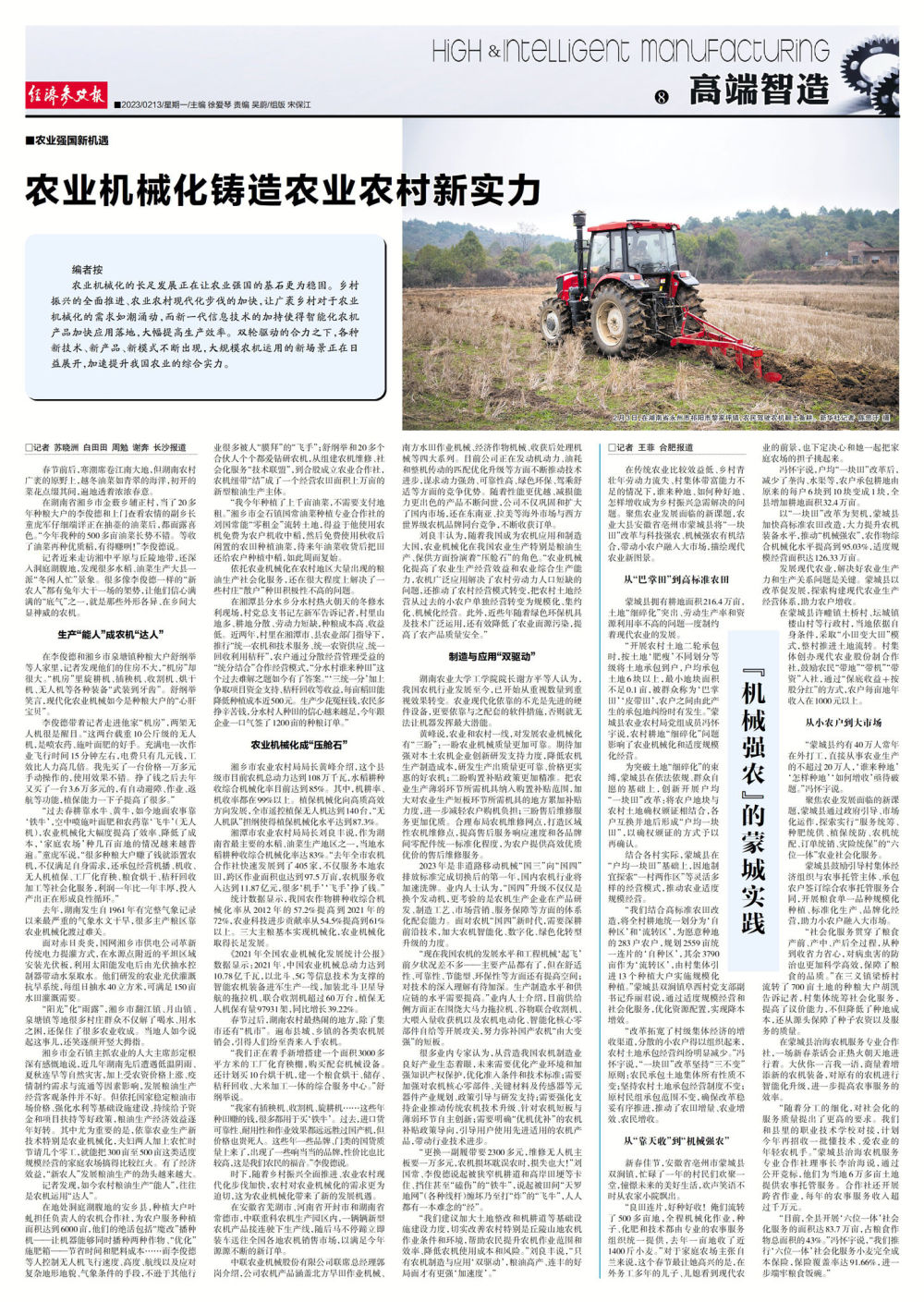 农业机械化的长足发展正在让农业强国的基石更为稳固。乡村振兴的全面推进、农业农村现代化步伐的加快,让广袤乡村对于农业机械化的需求如潮涌动,而新一代信息技术的加持使得智能化农机产品加快应用落地,大幅提高生产效率。双轮驱动的合力之下,各种新技术、新产品、新模式不断出现,大规模农机运用的新场景正在日益展开,加速提升我国农业的综合实力。
