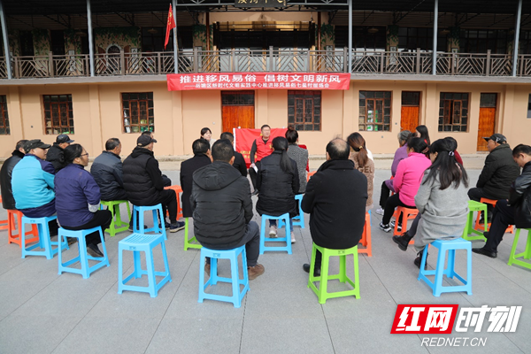 在昭山镇七星村“山那边”前坪,岳塘区新时代文明实践服务中心主任史韬来用通俗易懂的语言,从厚养薄葬、婚事新办、文明祭扫、破旧立新、保护环境五个方面,结合生动的案例,向大家讲解移风易俗的内容和推进移风易俗的意义,并倡导广大基层党员干部带头示范,做破除旧俗陋习、传播文明新风的推行者。现场,党员代表和村民代表纷纷表示“百善孝为先,我要多回家陪伴家人”“嫁女不收彩礼,我来带个头”,反响热烈。