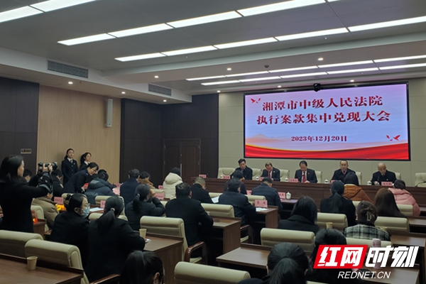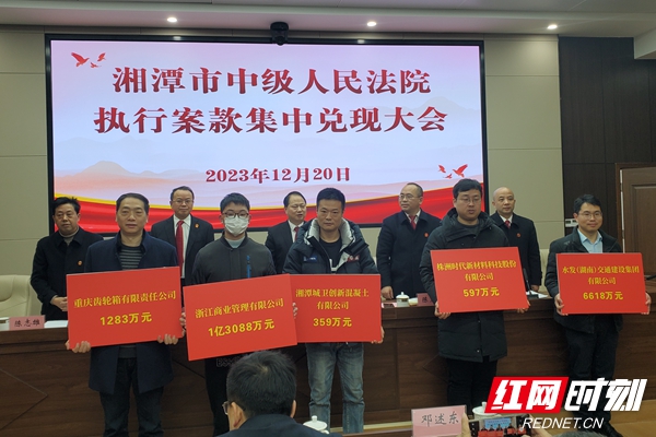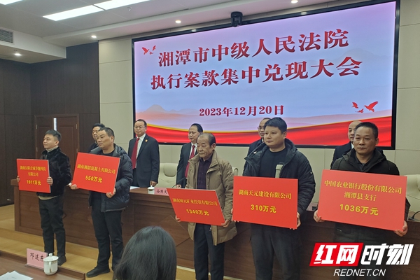 红网时刻新闻湘潭12月20讯(记者 谢文礼 通讯员 李灿)12月20日,湘潭市中级人民法院召开执行案款兑现大会,现场向10名执行申请人集中发放执行案款2.7亿元。部分省、市两级人大代表、政协委员等参加。