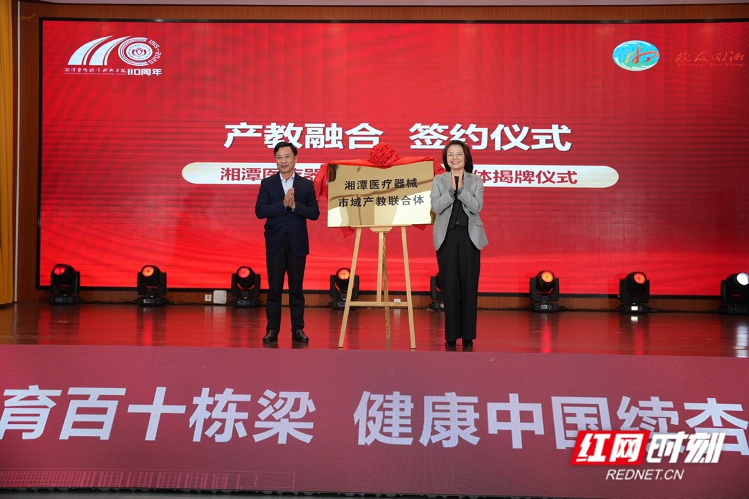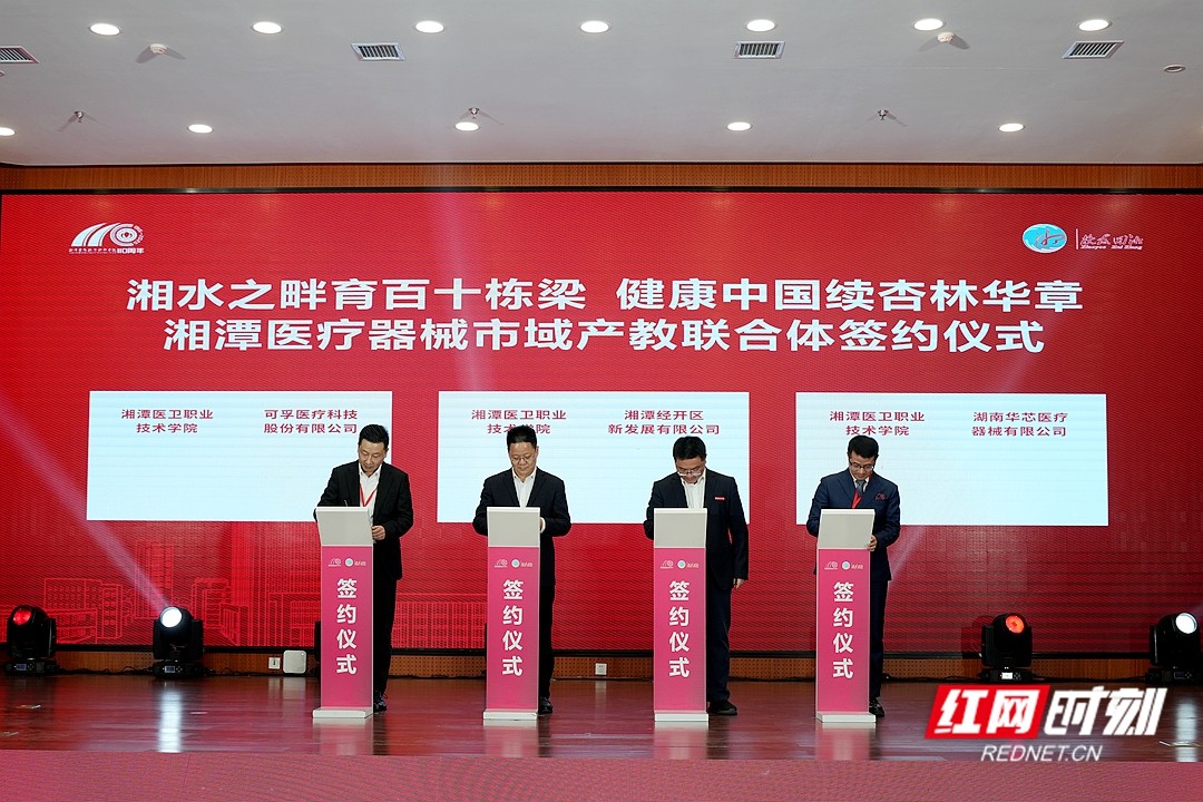 会上,一系列推动产教融合、服务地方发展的合作项目落地——该校与湘潭经开区签署校地合作共建协议;与中国医疗器械技术服务有限公司华中公司、中核健康投资有限公司签署校企人才联合培养协议。同时,由学校联合湖南省医疗器械产业园及园区企业共同牵头组建的“湘潭医疗器械市域产教联合体”正式签约并揭牌,标志着产教深度融合进入新阶段。