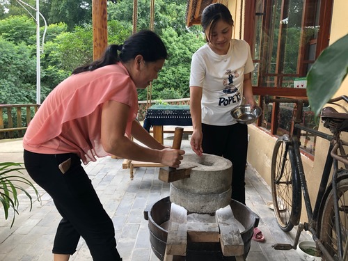 6月5日,湖南省韶山市韶山村的梦稀乡宿里,二人在用老式磨子磨米粉。 新华社记者 陈宇箫摄